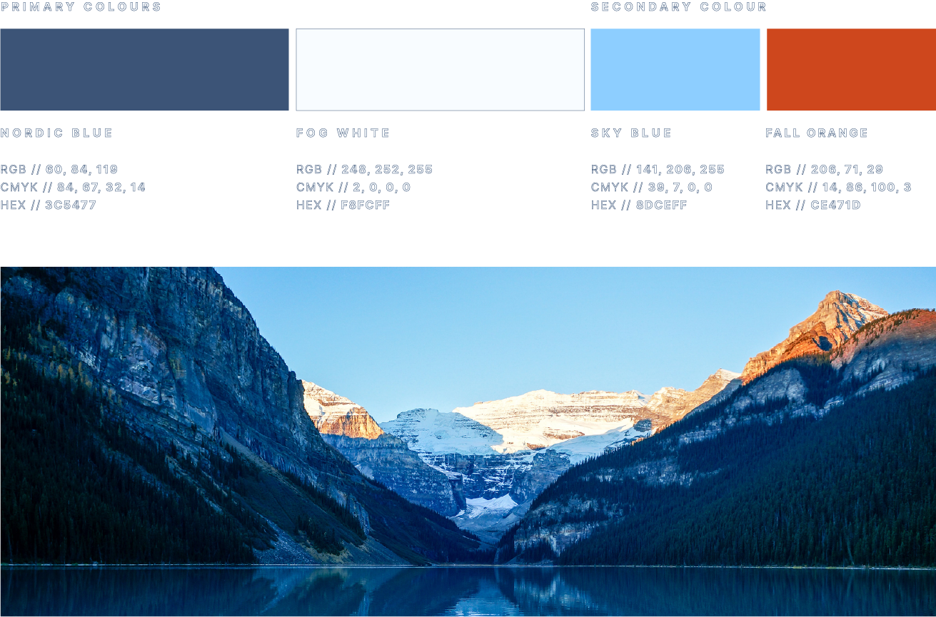 The colour palette is inspired by the landscape of Nordic regions - a deep blue from the Fjords and mountains that blend into snow-white peaks.